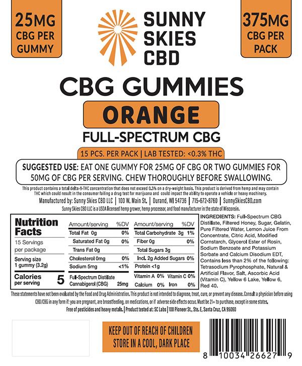 CBG Gummies are a tasty and easy way for dosing! Sunny Skies Orange 25mg Full Spectrum CBG Gummies are non-GMO and free of contaminants (lab tested for pesticides and heavy metals). Each bag contains 15 Gummies while each jar contains 50 Gummies, each of which contains 25mg of CBG (275mg CBG per bag and 1,250mg CBG per jar). Contains <0.3% THC.